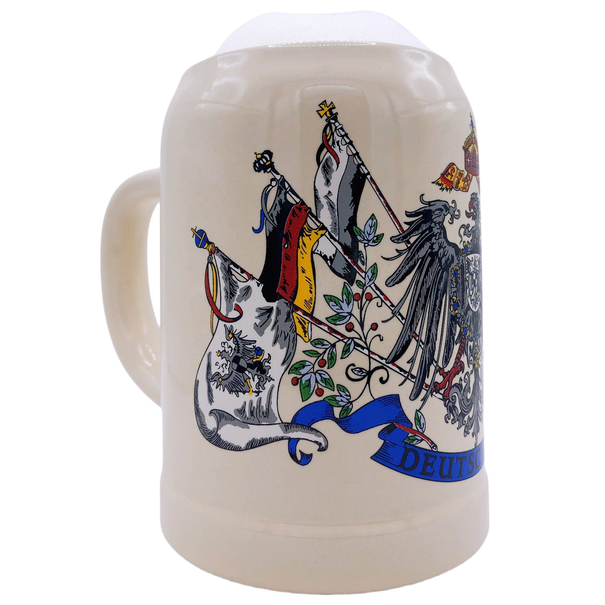 - TRADITIONELLES DESIGN: Traditioneller deutscher Bierkrug mit kunstvoll gestaltetem Wappen-Design und dekorativen Elementen in klassischen Farben.