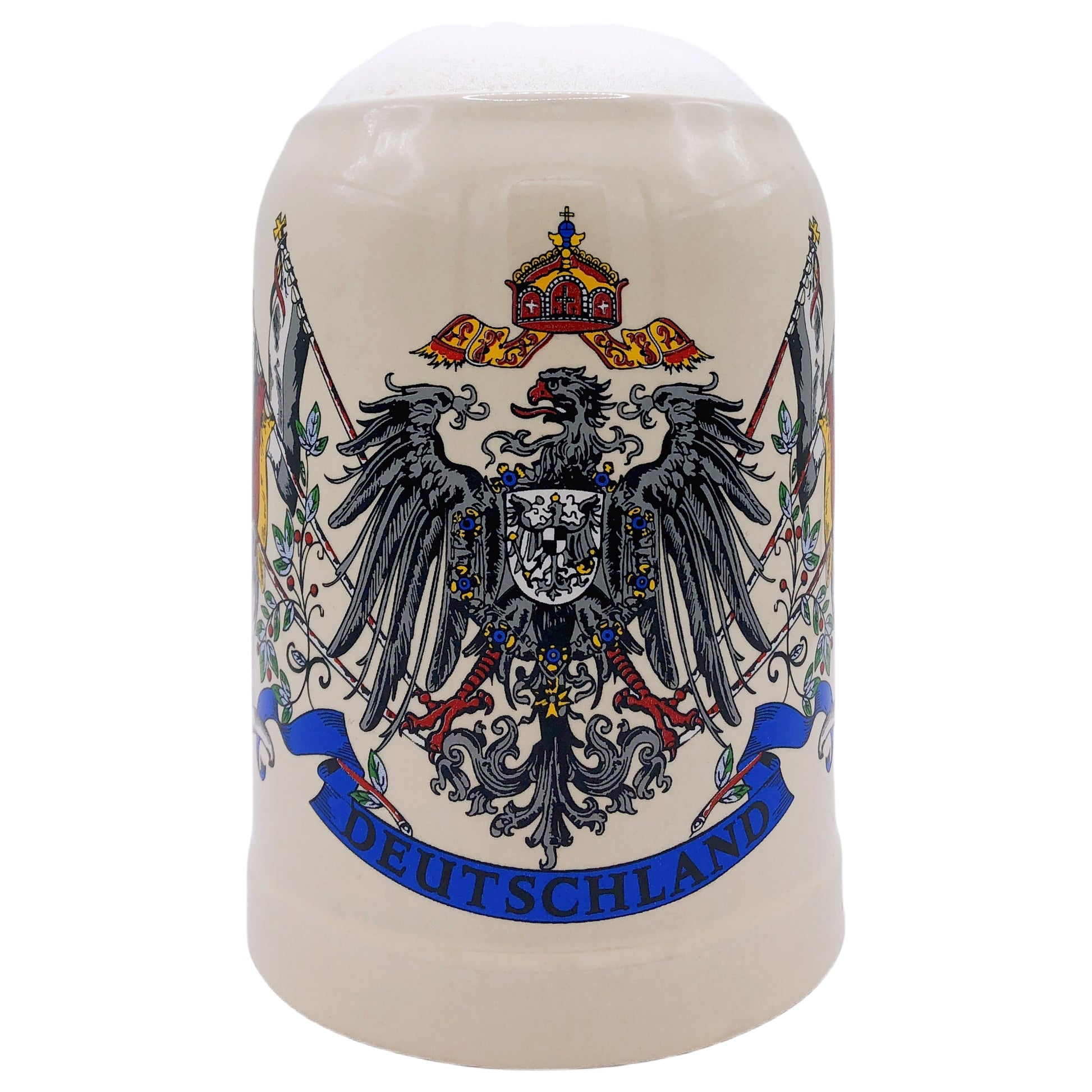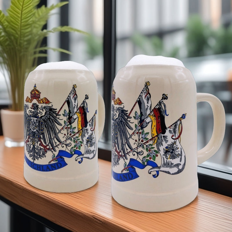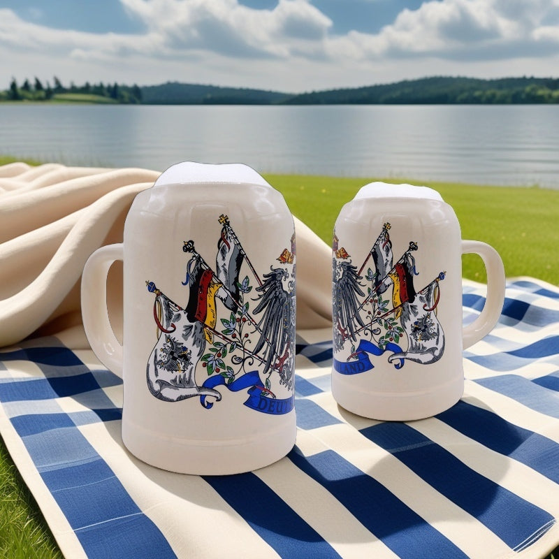 Dieser traditionelle deutsche Bierkrug mit einem Fassungsvermögen von 0,5 Litern ist ein beeindruckendes Stück deutscher Braukultur. Der robuste Steinkrug ist mit einem kunstvoll gestalteten Wappen-Design verziert, das einen majestätischen Adler und klassische heraldische Elemente in lebendigen Farben zeigt. Die hochwertige Verarbeitung und das zeitlose Design machen diese Bierseidel zu einem perfekten Geschenk für besondere Anlässe wie Geburtstage. Der creme-/blaufärbende Krug besticht durch seine klassische Form und die detailreiche Gestaltung, die deutsche Tradition und Handwerkskunst widerspiegelt. Das großzügige Volumen und der bequeme Henkel sorgen für ein authentisches Biererlebnis. Ein würdiges Gefäß für gesellige Stunden und ein besonderes Geschenk für Bierliebhaber, das deutsche Brautradition auf stilvolle Weise in Szene setzt.