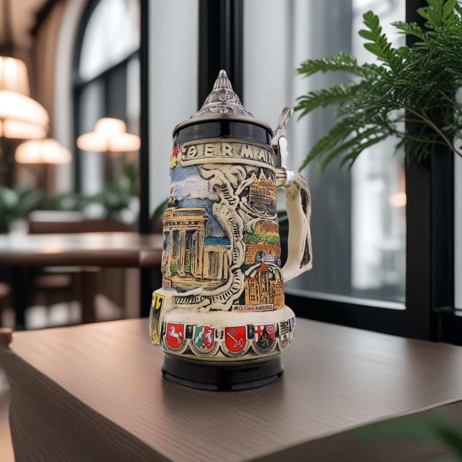 Detailreiche Verzierungen: Der Krug ist mit farbenfrohen Abbildungen von Städten und Sehenswürdigkeiten wie Berlin, Frankfurt, Köln, München, Heidelberg, Rothenburg und Neuschwanstein verziert, die die Vielfalt der deutschen Architektur widerspiegeln.